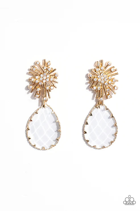 An explosion of radiating gold bars is topped with a sprinkle of white rhinestones, creating a stellar anchoring point. Swinging below the starburst, an oversized, clear teardrop with a light-catching, faceted surface is wrapped in a textured border of gold, adding stunning dimension and refinement to the cosmic combination. Earring attaches to a standard post fitting.