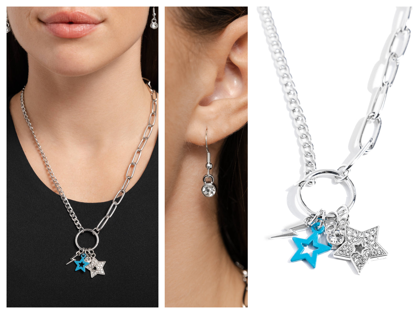 A strand of silver paperclip chain collides with a dainty curb chain to create an abstract blend of grit and glitz. Each chain connects to a silver ring that features a silver lightning bolt, white gem, white rhinestone-encrusted silver star, and Capri Blue-painted star, creating a perfectly balanced stellar design. Features an adjustable clasp closure.