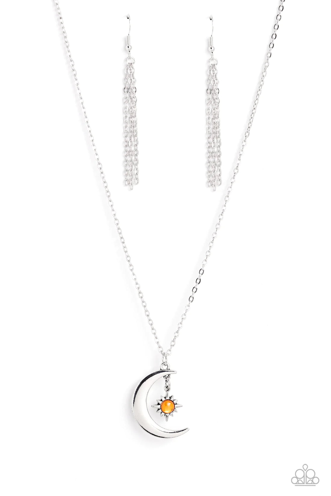 A glassy orange bead is pressed into the center of a three-dimensional silver star that dances from the top of a silver crescent moon pendant, creating a celestial pendant at the bottom of a dainty silver chain. Features an adjustable clasp closure.