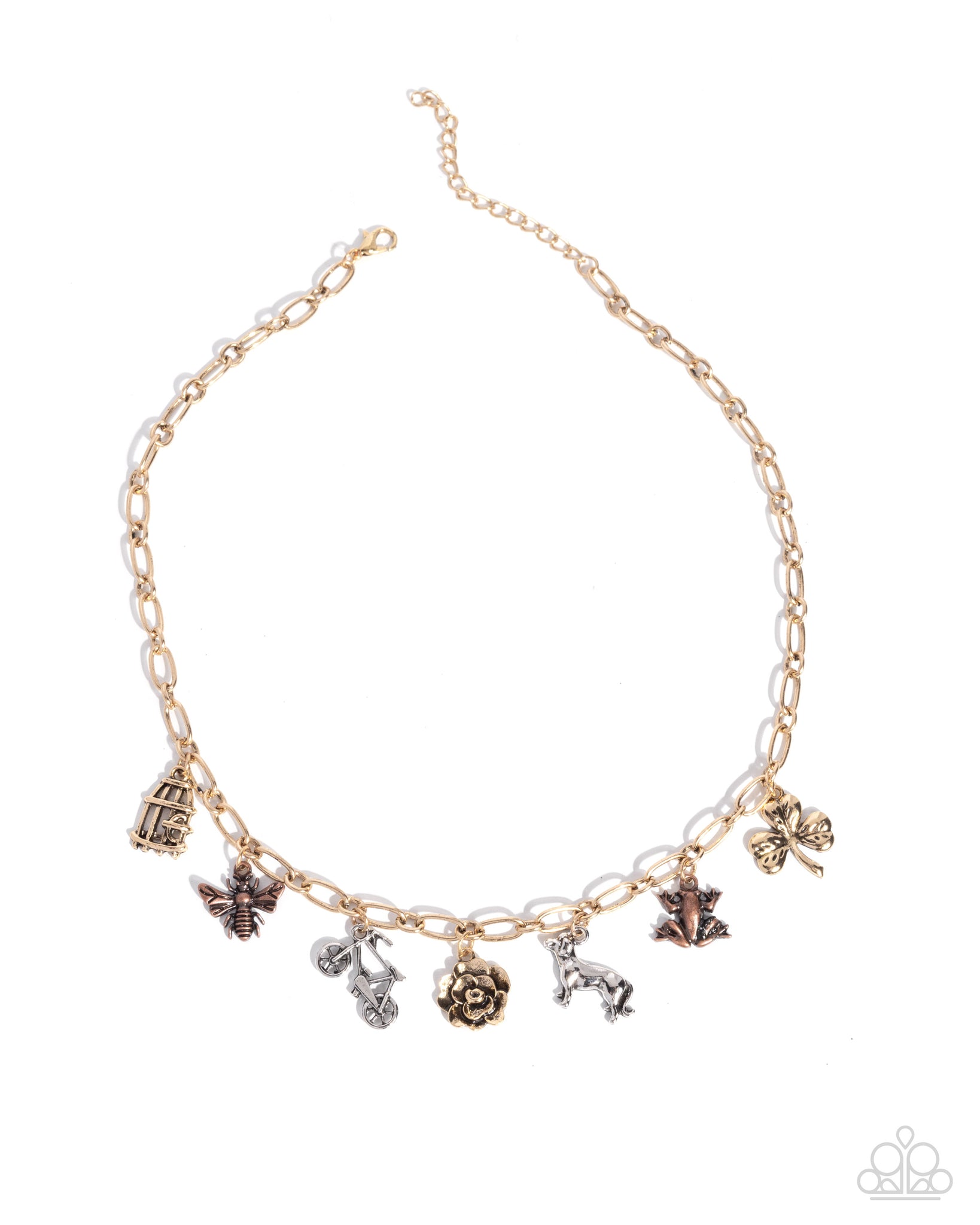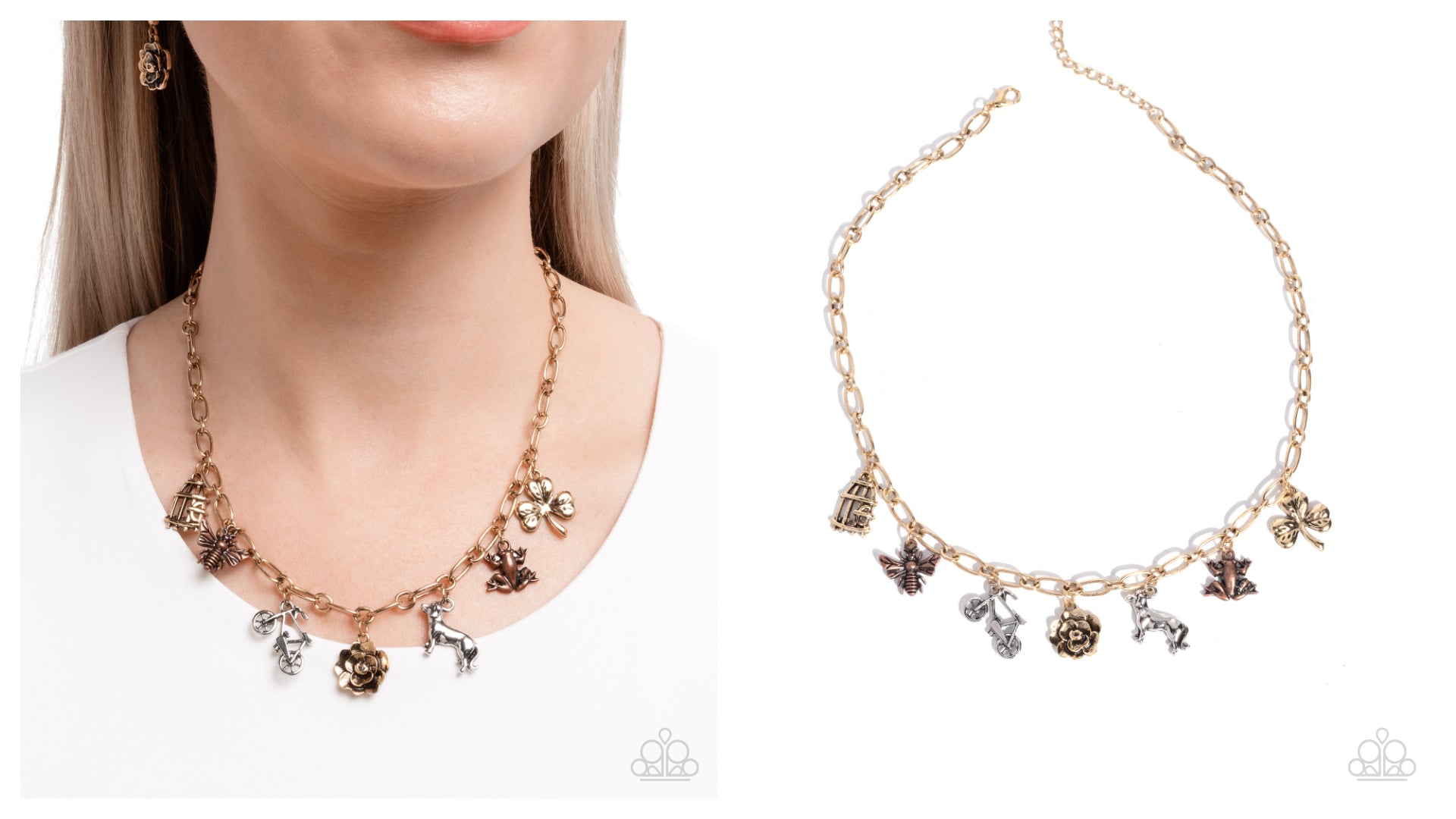 Gliding along an abstract antiqued gold chain, a whimsical collection of multicolored charms including an antiqued gold bird cage, a copper bee, a silver bike, an antiqued gold three-dimensional flower, a silver dog, a copper frog, and an antiqued gold leaf-patterned shamrock coalesce below the neckline for an eye-catching eclectic display. Features an adjustable clasp closure.