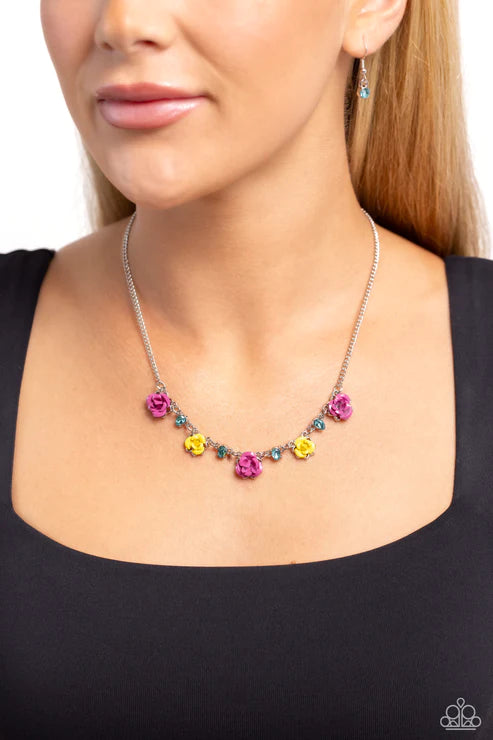Painted in High Visibility and Rose Violet hues, various metal roses delicately alternate with upside-down blue teardrop gems across a dainty silver chain, blooming into a seasonal centerpiece. Features an adjustable clasp closure.