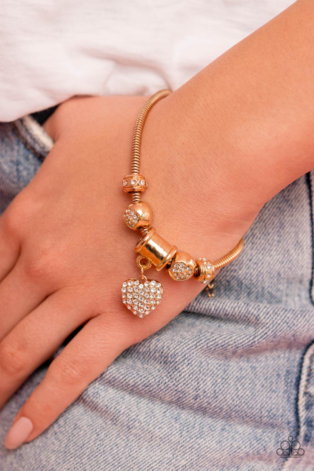 Gold bracelet with rope style chain and clasp closure. Beads and Heart incrusted with white rhinestones.