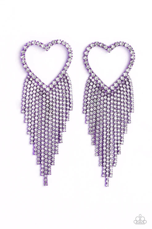 Glassy white rhinestones, encrusted along the front of a purple heart frame, create a flirty centerpiece. Staggered rows of white rhinestones pressed in delicate purple square fittings cascade from the sparkly centerpiece, adding glitzy movement to the romantic piece. Earring attaches to a standard post fitting.