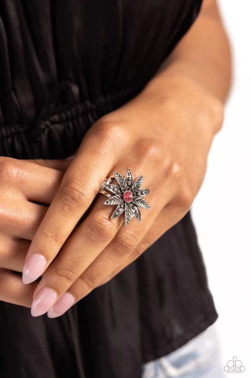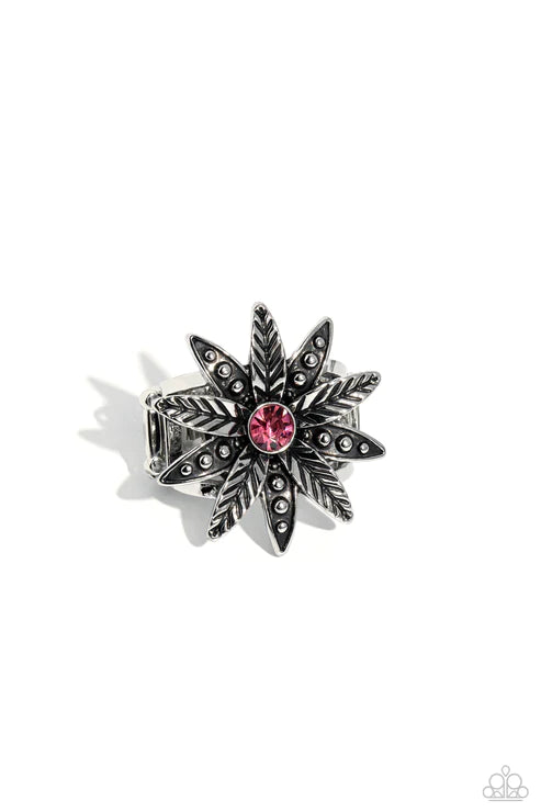 Unfurling around a pink gem center, textured and studded silver petals alternate atop airy silver bands on the finger for a whimsically botanical centerpiece. Features a stretchy band for a flexible fit.