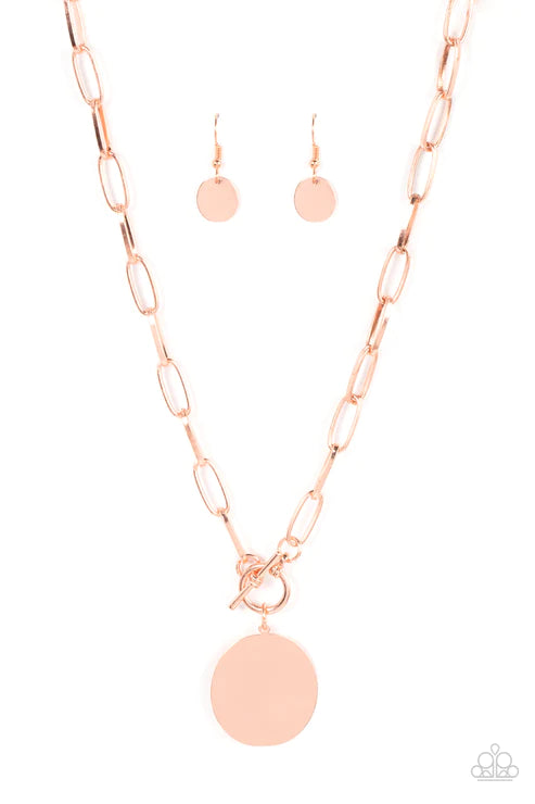 An oversized oval shiny copper disc swings from the bottom of a substantial oval linked shiny copper chain, resulting in a gritty industrial pendant below the collar. Features a toggle closure.