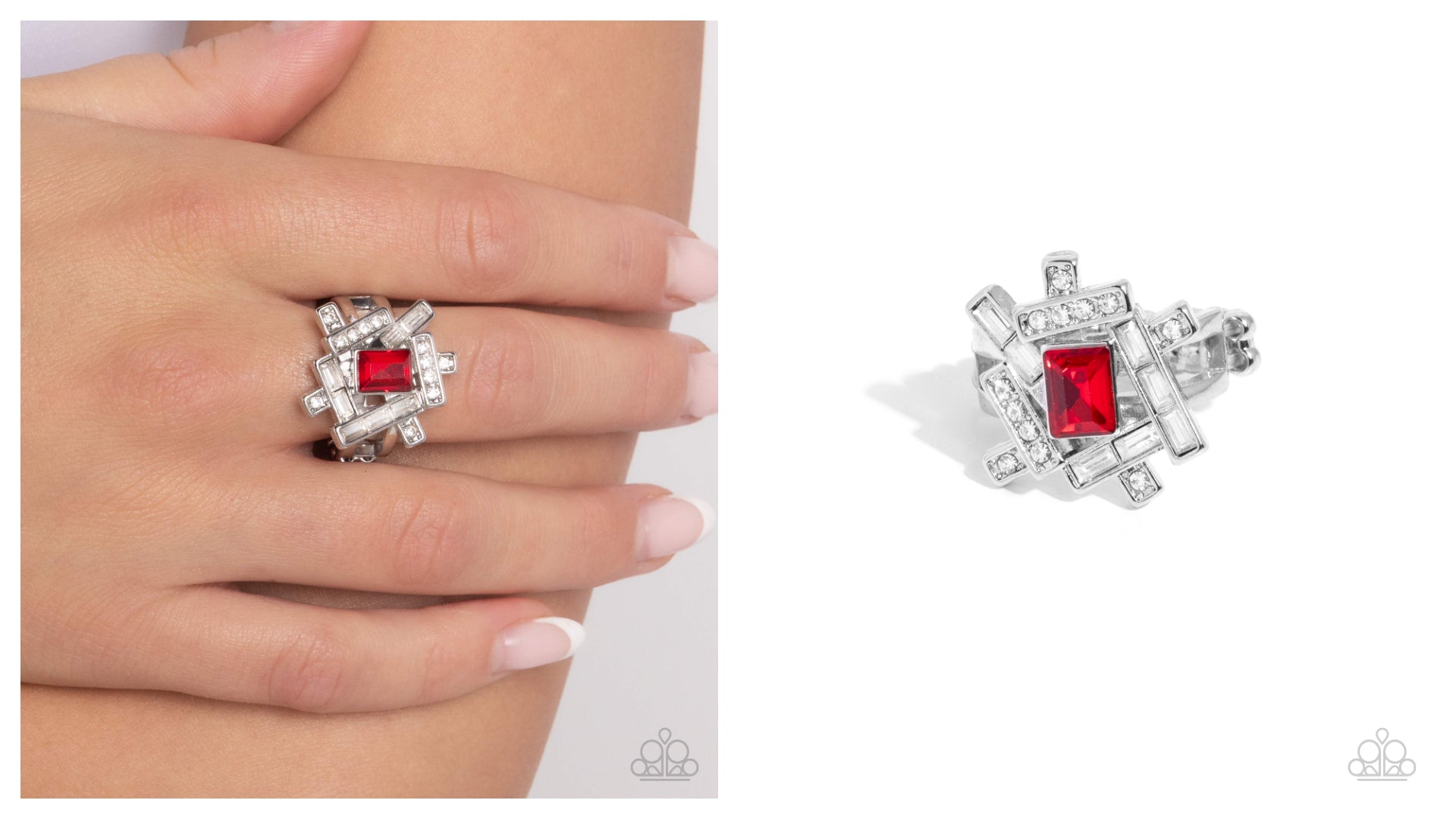 An emerald-cut red gem is surrounded and framed by white rhinestone and white emerald-cut gem-embellished silver bars that are tilted on a point. The faceted surface of the centerpiece catches and reflects the light of the accents that surround it, magnifying its impressive impact. Features a dainty stretchy band for a flexible fit.
