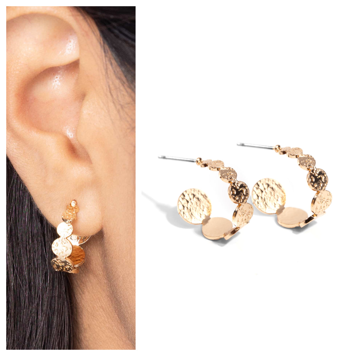 Dainty hammered gold discs curl around the ear for a textured statement. Earring attaches to a standard post fitting. Hoop measures approximately 1/2" in diameter.