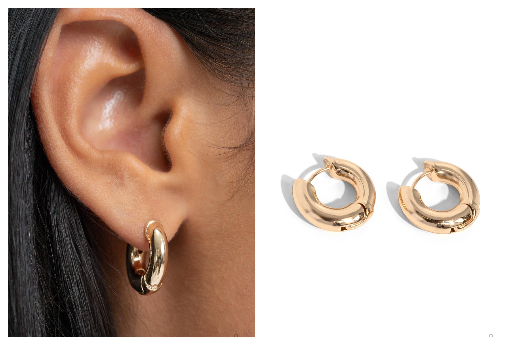 Featuring a beveled textured surface, a gold hoop snugly curls around the ear for a dainty, basic look. Earring attaches to a standard hinge closure fitting. Hoop measures approximately 1/2" in diameter.