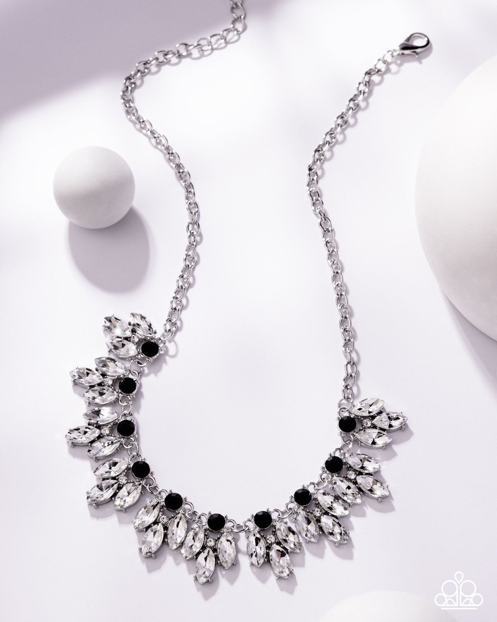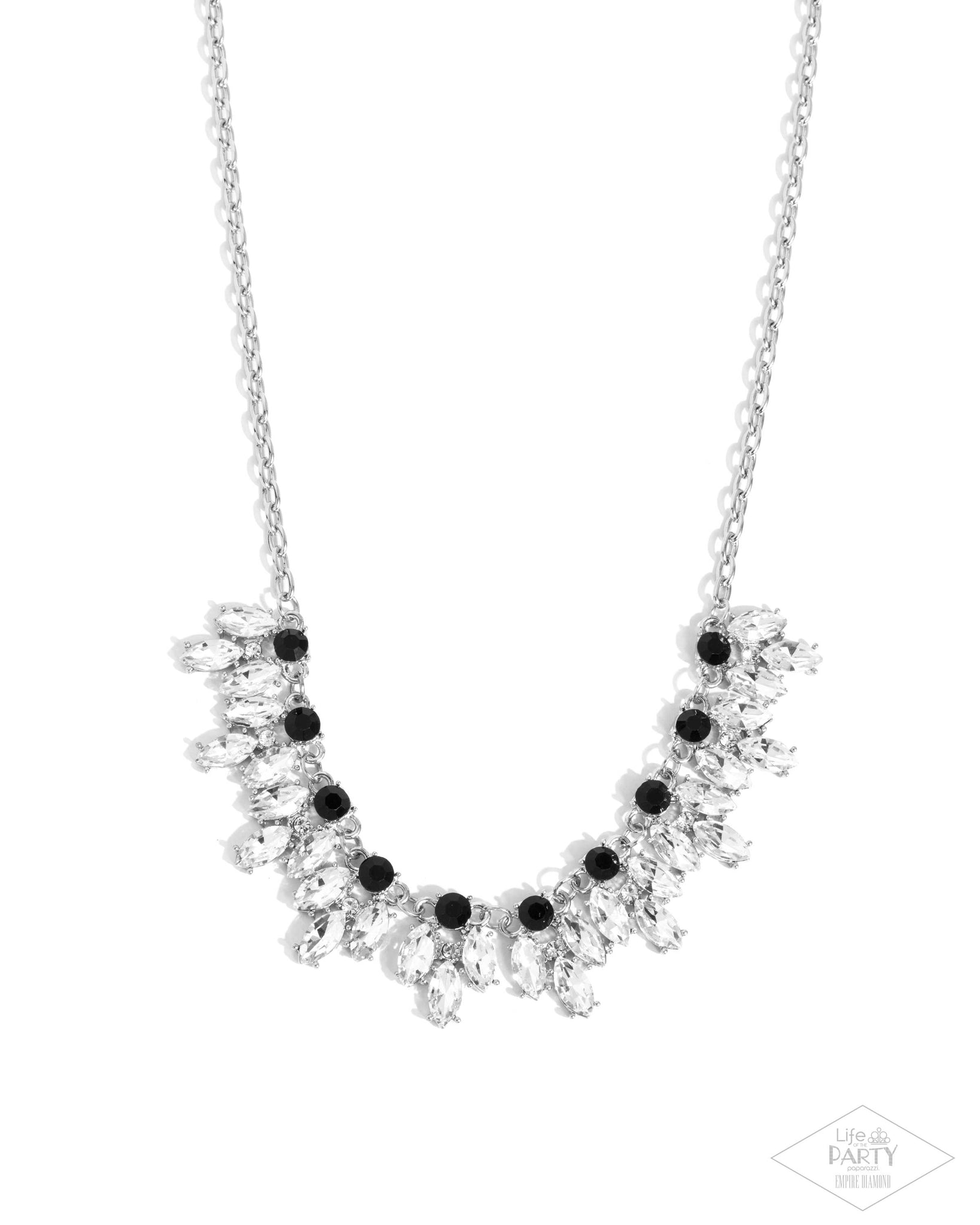 Featuring regal marquise cuts, glittery white rhinestones flare from the bottom of classic black rhinestones, linking into a fringe of elegant frames below the collar in a timeless fashion. Features an adjustable clasp closure.