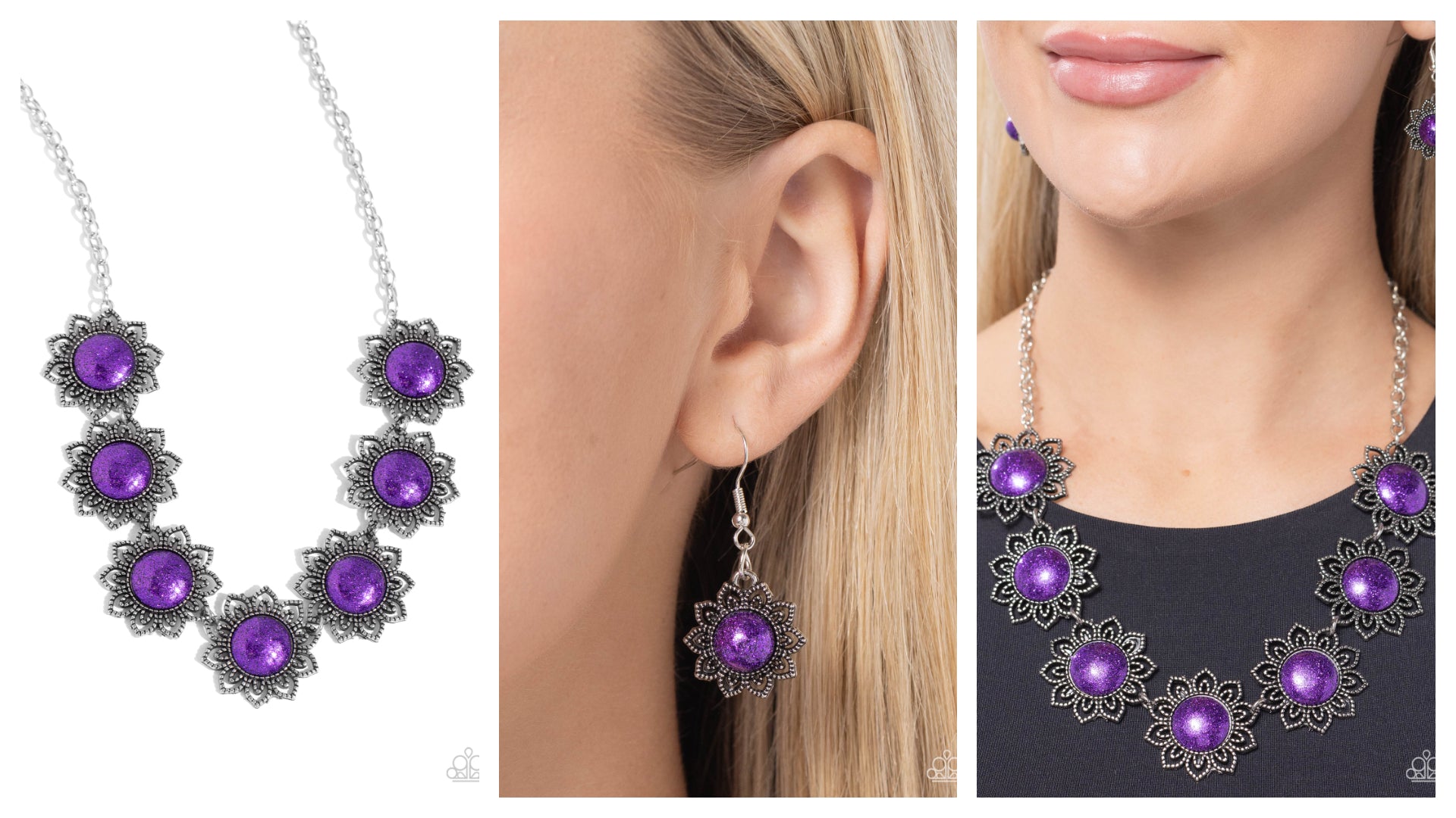 Studded in tactile detail, a collection of silver mandala-like floral frames with purple glittery centers connect below the collar from a classic silver chain for a gorgeous pop of color. Features an adjustable clasp closure.