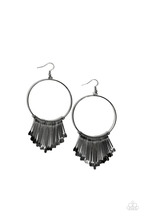 A glistening collection of flat gunmetal ladle-like rods swings from the bottom of a gunmetal wire hoop, resulting in an edgy fringe. Earring attaches to a standard fishhook fitting.