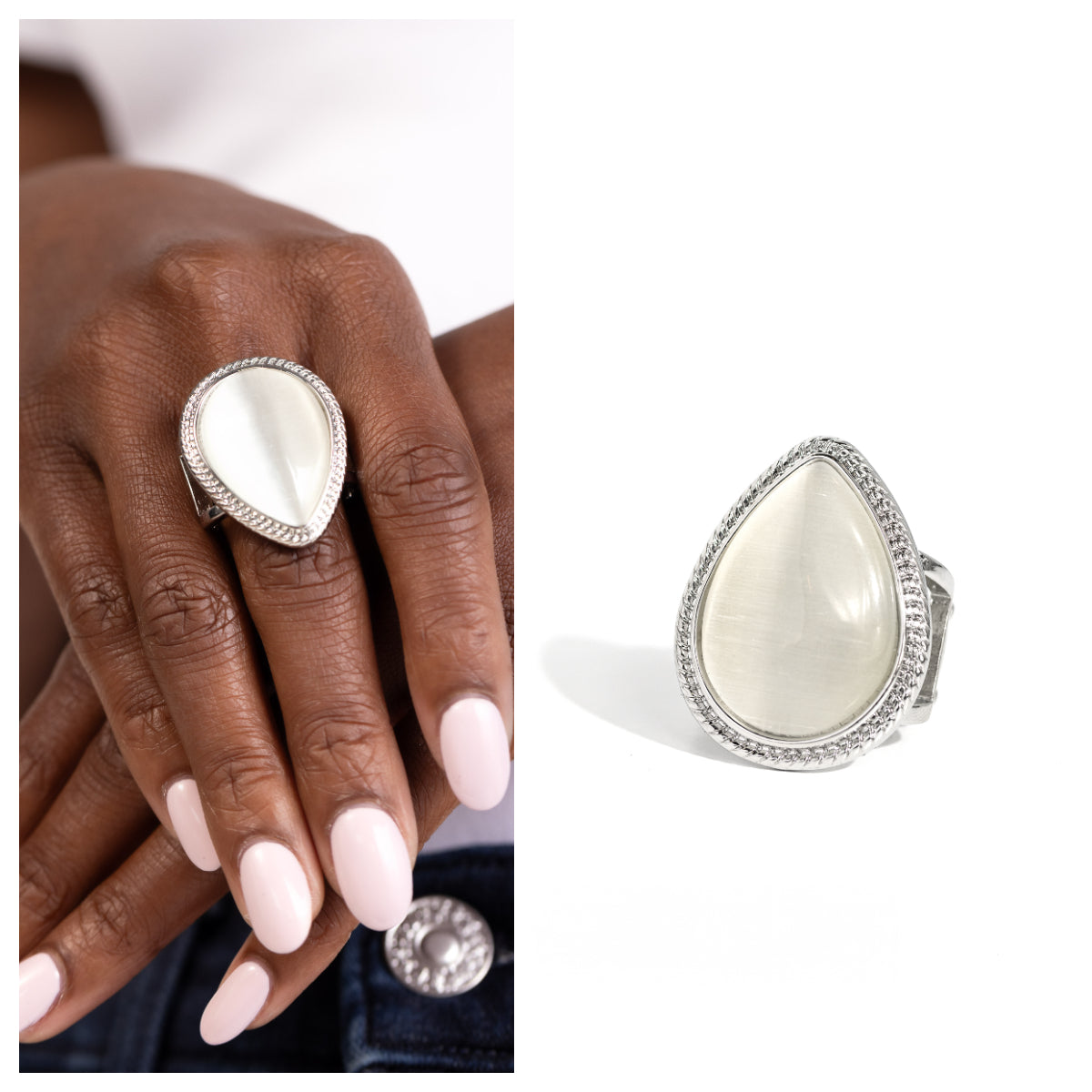 Encased in a layered silver frame of smooth rope-like texture, an oversized white cat's eye teardrop shines amongst airy bands of silver, creating a dramatic display of color atop the finger. Features a stretchy band for a flexible fit.