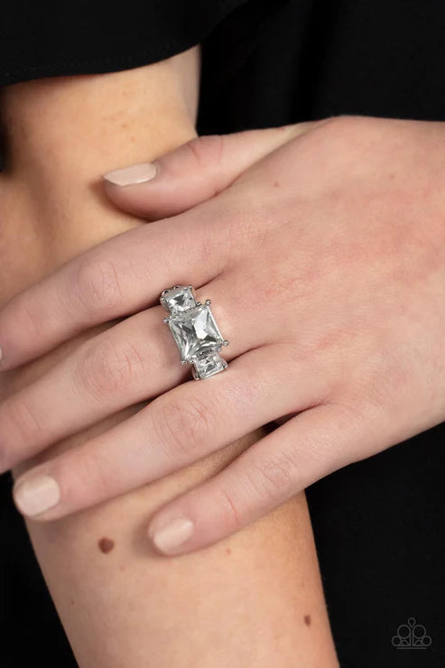 Featuring regal princess cuts, three brilliant white rhinestones sparkle inside pronged silver fittings atop the finger in a dramatic finish. Features a dainty stretchy band for a flexible fit.