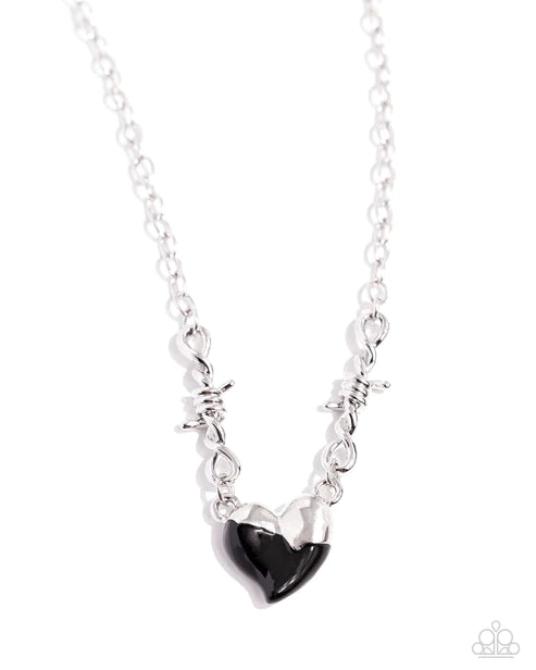 Twists of silver and a half-silver, half-, black-painted heart connect to a classic silver chain around the collar for a trendy statement. Features an adjustable clasp closure.