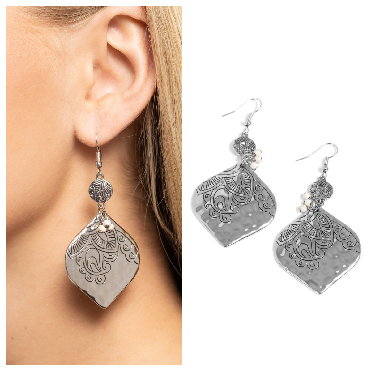 A dainty silver disc and hammered teardrop frame are stamped in a tropical floral pattern as they link into a shimmery lure. A cluster of dainty white beads is added to the whimsical display, invoking a pop of seasonal color. Earring attaches to a standard fishhook fitting.