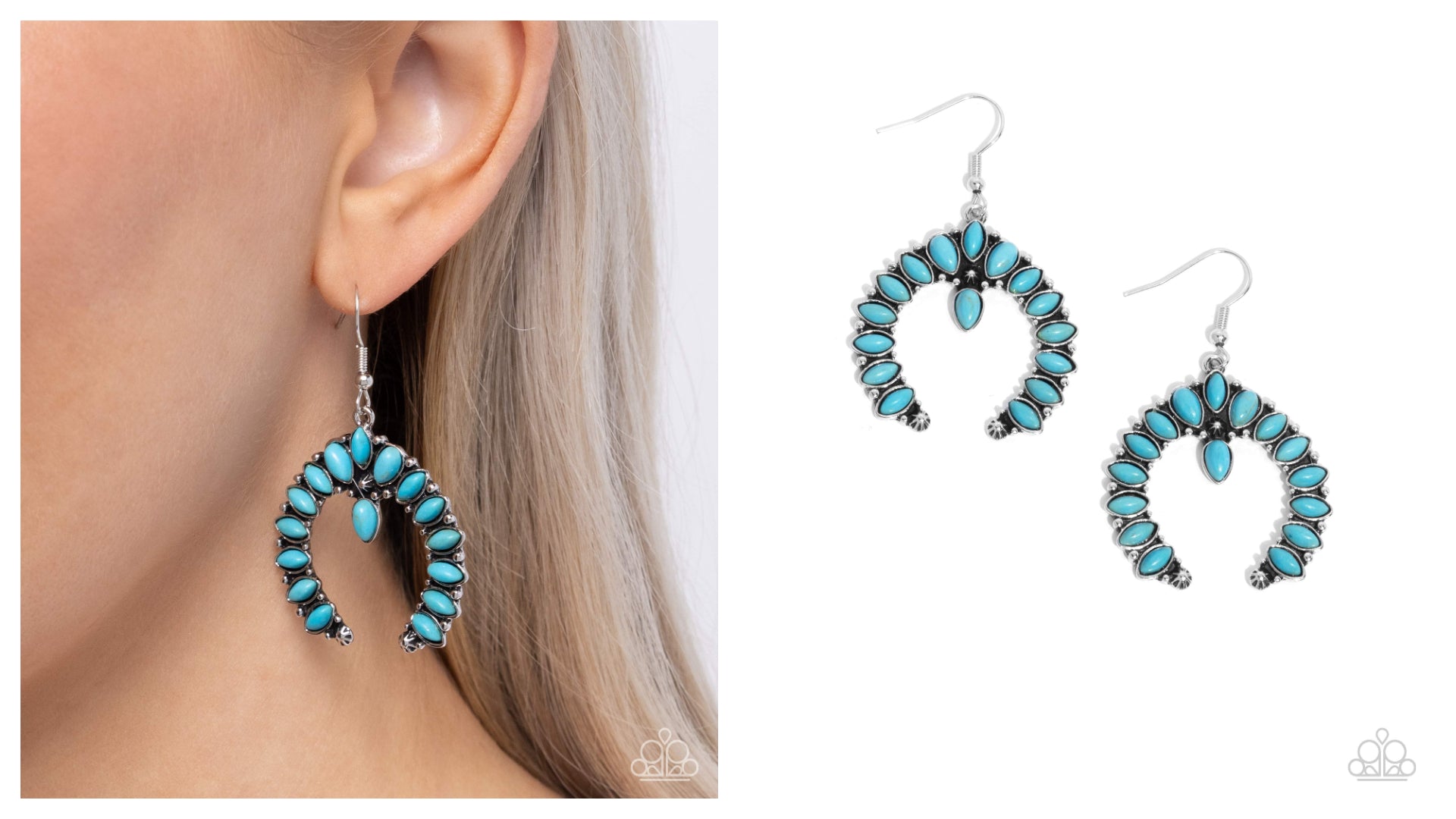 Embellished in teardrop and marquise-cut turquoise stones that pattern in a free-spirited array, an upside-down silver-studded horseshoe curls below the ear. A solitaire turquoise teardrop stone dots the inner center of the horseshoe for additional earthy elegance. Earring attaches to a standard fishhook fitting. As the stone elements in this piece are natural, some color variation is normal.