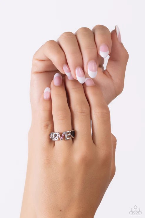 Glistening silver letters arc across the finger, forming the word "LOVE" for a causally romantic finish. The letter "O" features a black-painted peace sign, the letter "V" features various shades of pink and iridescent rhinestones, while a black-painted heart caps the word, infusing the design with color. Features a dainty stretchy band for a flexible fit. Due to its prismatic palette, color may vary.