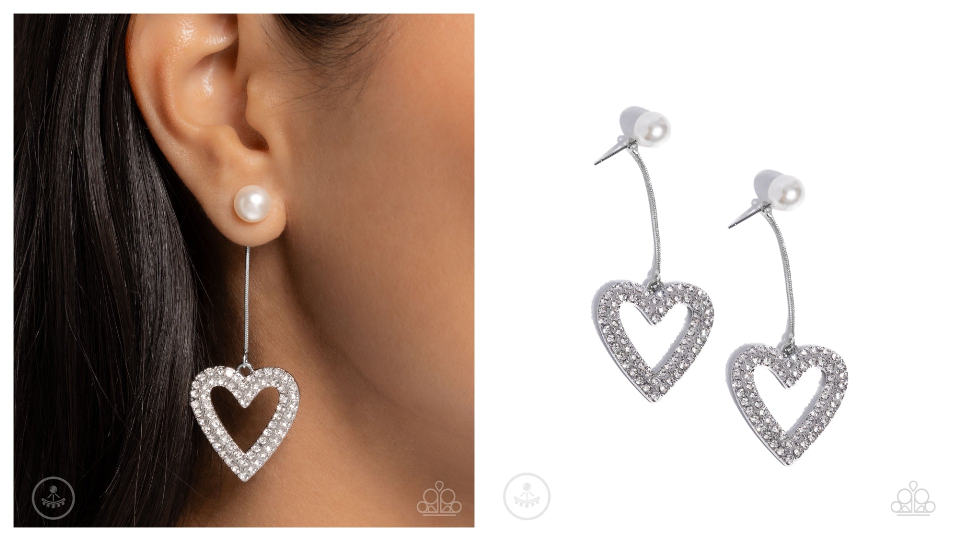 A solitaire white pearl attaches to a double-sided post, designed to fasten behind the ear. Dusted in glistening white rhinestones, a silver heart pendant peeks out beneath the ear from a dainty silver snake chain for a glamorous look. Earring attaches to a standard post fitting.