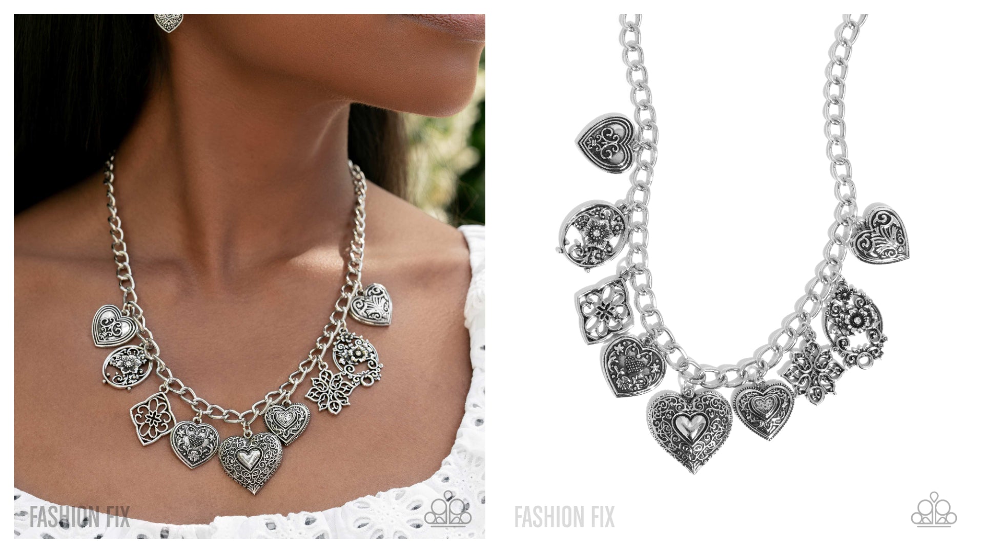 Featuring an array of whimsical and romantically curly filigree patterns, a collection of silver hearts and ornate silver charms, some with white rhinestone detailing, swing from the bottom of a shimmery silver cable chain, creating a vintage-inspired fringe below the collar. Features an adjustable clasp closure.