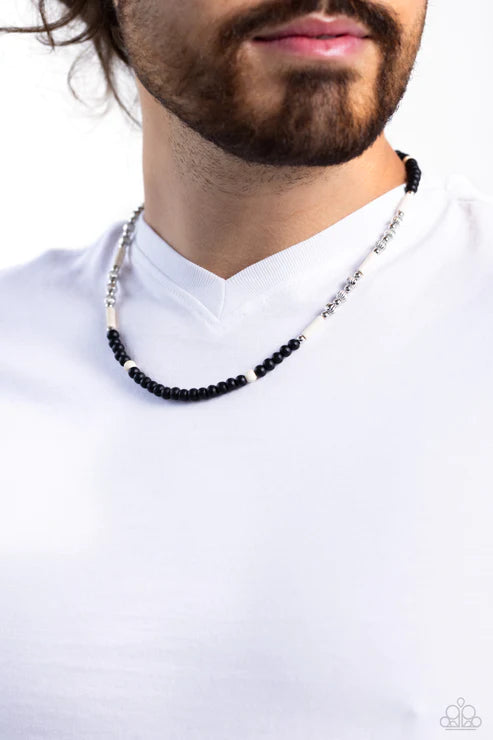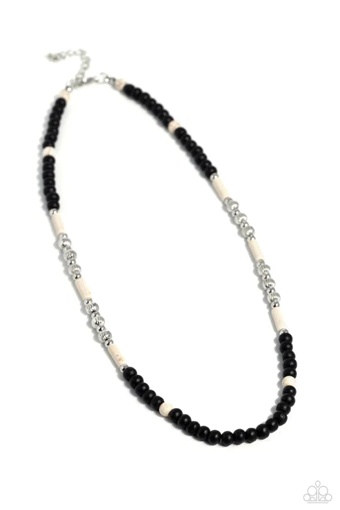 Black wooden beads, striped silver beads, silver studs, white cylindrical stones, and marbled, white round stones are threaded along an invisible wire, creating an urban pop of color below the collar. Features an adjustable clasp closure. As the stone elements in this piece are natural, some color variation is normal.