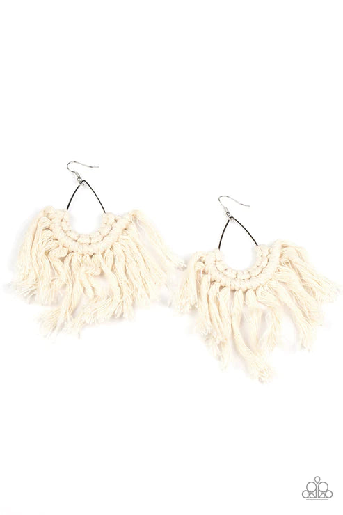 Tassels of white thread decoratively knot at the bottom of a shiny silver teardrop, creating an earthy fringe. Earring attaches to a standard fishhook fitting.