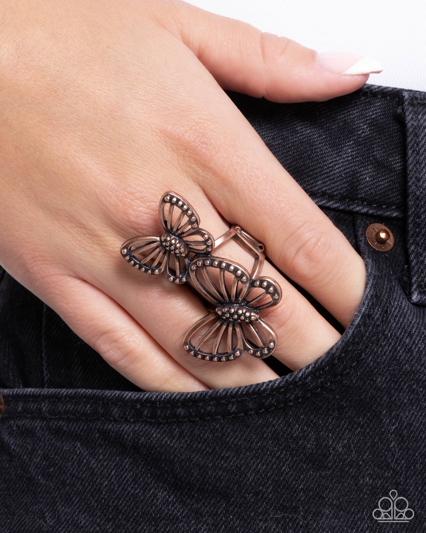 Veined with lifelike textures, a pair of rustic stud-embellished copper butterflies flutters atop the finger for a whimsical fashion. Features a stretchy band for a flexible fit.