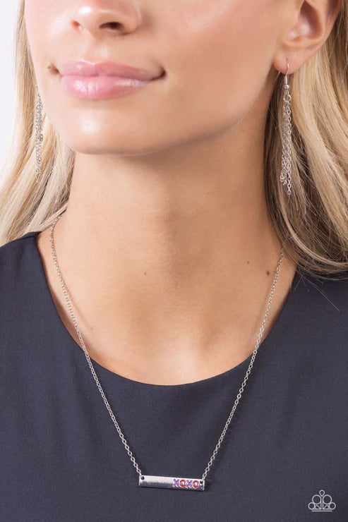 Featuring red and purple paint, a dainty silver rectangular frame stamped with the letters, "XOXO" is suspended by a dainty silver chain below the collar for a valentines-inspired look. Features an adjustable clasp closure.