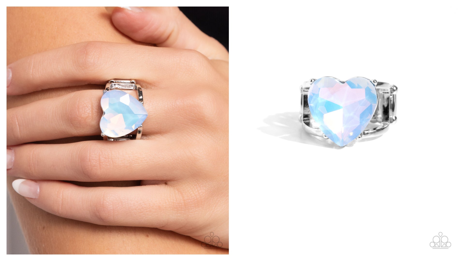 Pronged in the center of an airy, silver band, a blue opalescent heart glitters atop the finger for a youthful, Y2k-inspired centerpiece. Features a stretchy band for a flexible fit.