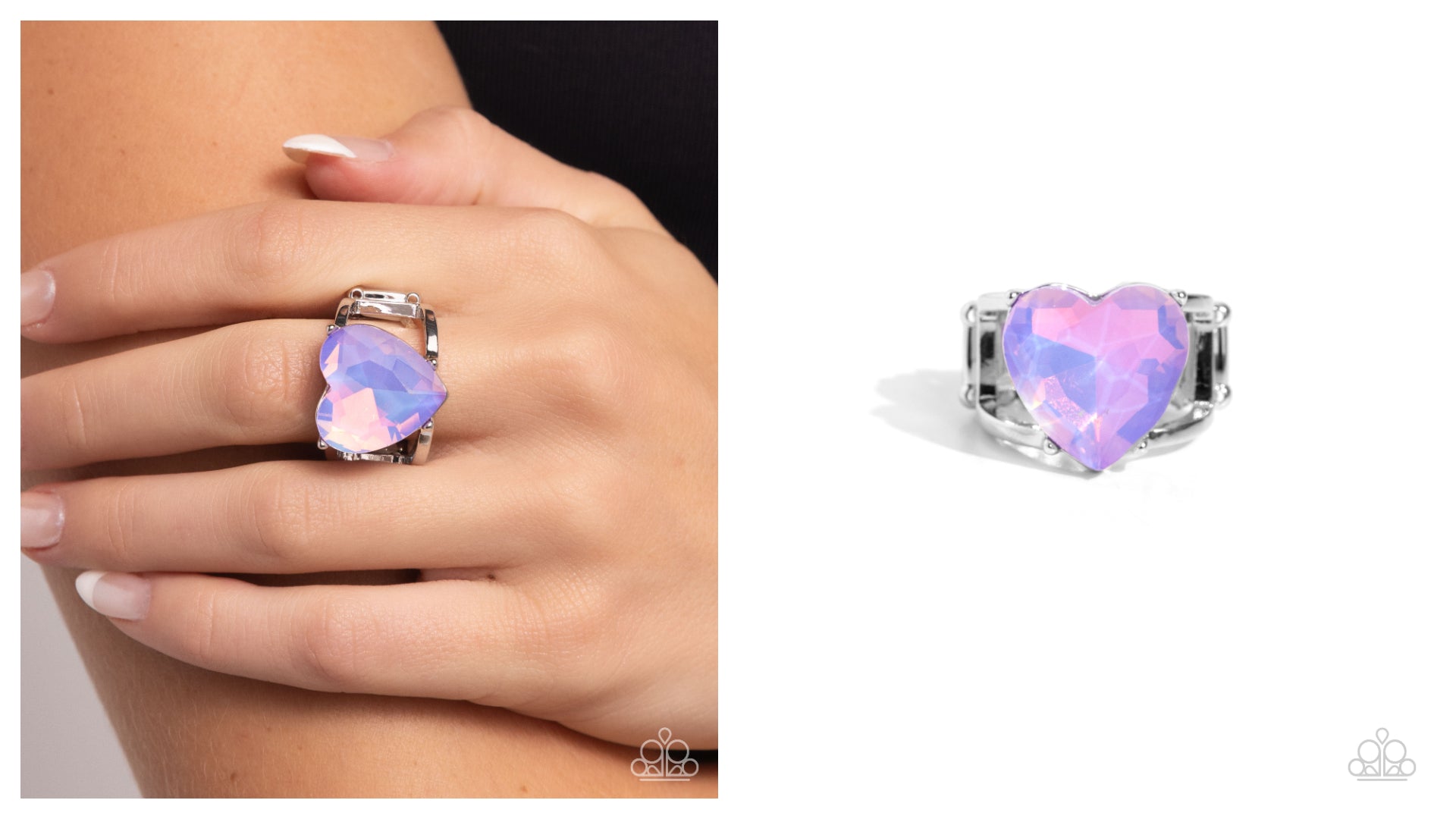 Pronged in the center of an airy, silver band, a purple opalescent heart glitters atop the finger for a youthful, Y2k-inspired centerpiece. Features a stretchy band for a flexible fit.