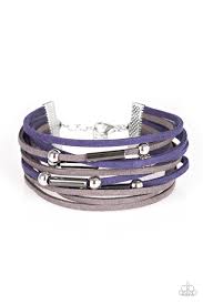 Strung between two silver fittings, glistening silver and gunmetal accents slide along strands of gray and blue suede for a seasonal look. Features an adjustable clasp closure.
