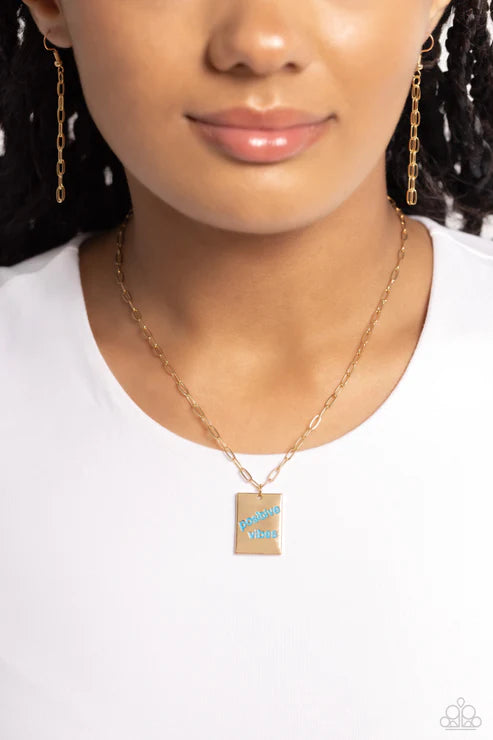 A rectangular gold pendant is stamped with the phrase "positive vibes" in a vibrant blue font at the bottom of a trendy, dainty gold paperclip chain, creating an inspiring pendant below the collar. Features an adjustable clasp closure.