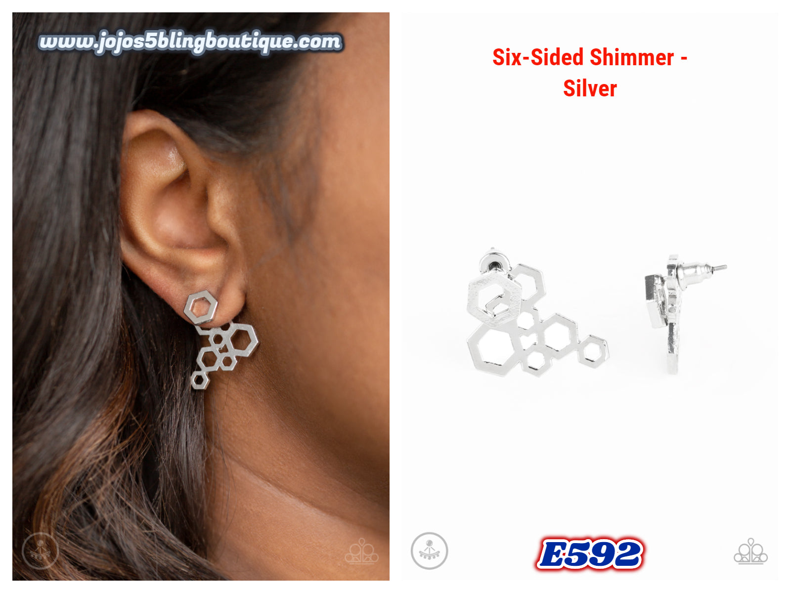 A dainty silver hexagon attaches to a double-sided post, designed to fasten behind the ear. Brushed in a high-sheen shimmer, a cascade of hexagonal frames peeks out beneath the ear for a bold geometric look. Earring attaches to a standard post fitting.